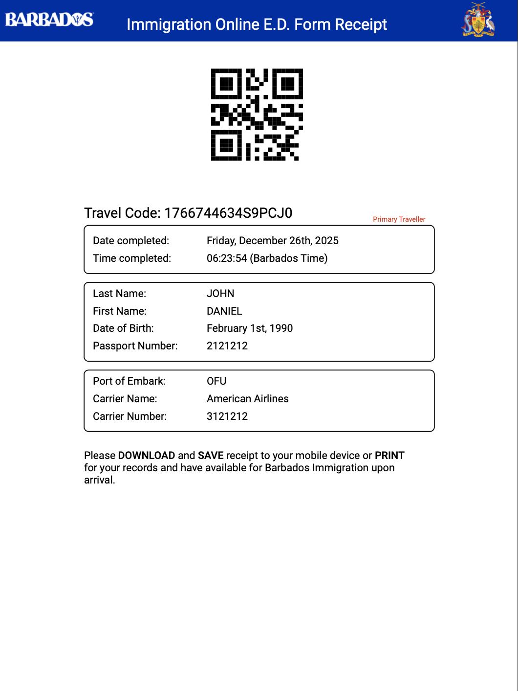 All travelers — including citizens, residents, visitors, and minors — are required to complete an individual ED Card prior to arrival. The form collects passport details, travel information, and customs declarations in a single online submission. Once completed, the ED Card is electronically registered with Barbadian immigration systems, meaning no physical document or passport stamp is required, though keeping a digital copy is recommended.