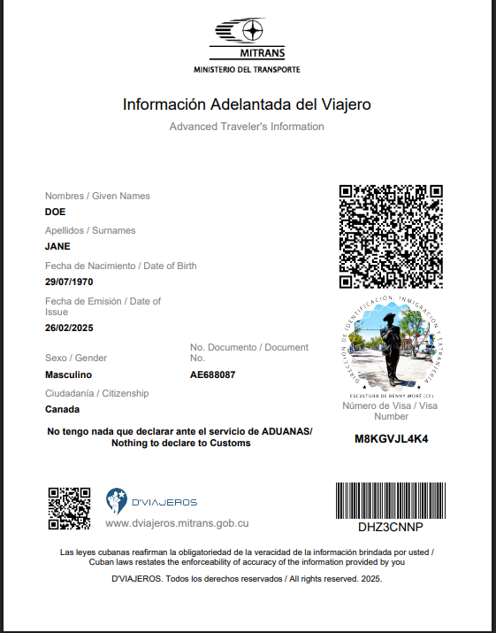 Once accepted, your D’VIAJEROS information is electronically linked to your passport and travel details within the Cuban government system. You do not need to print or present a separate document at the border—Cuban immigration officers can verify your registration electronically.